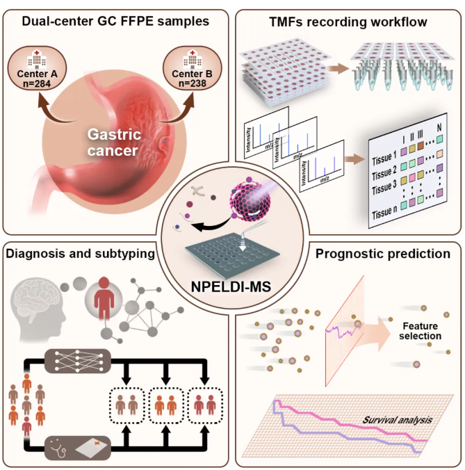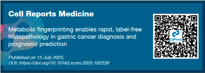 2025年7月15日,上海交通大学钱昆教授、复旦大学附属中山医院汪学非教授、复旦大学附属闵行医院刘绍群教授、苏州大学附属第一医院郭凌川教授团队合作在Cell Press细胞出版社期刊Cell Reports Medicine发表了一篇题为“Metabolic fingerprinting enables rapid, label-free histopathology in gastric cancer diagnosis and prognostic prediction”的研究论文。该研究首次报道了一种基于纳米粒子增强激光解吸电离质谱的组织代谢指纹分析技术,实现了对胃癌组织的快速(约40分钟/样本)、无标记、高精度的病理诊断,一次检测实现良恶性区分、分子分型和预后预测,为胃癌临床病理实践提供了强大的新工具。