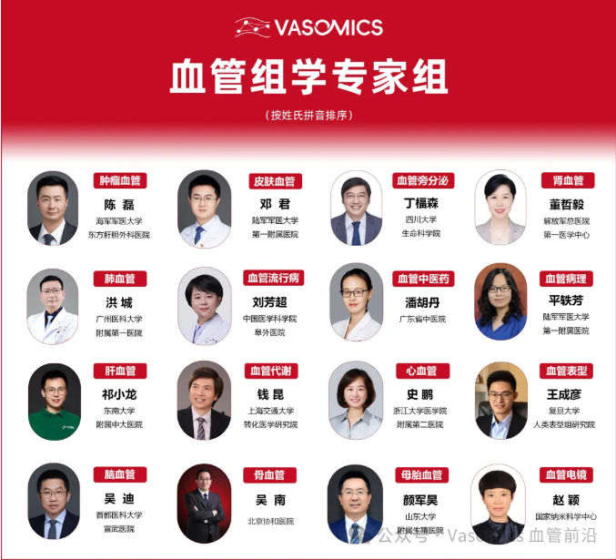 血管组学专家组由多学科青年专家联合发起(按姓氏拼音排序):海军军医大学东方肝胆外科医院陈磊(肿瘤血管)、陆军军医大学第一附属医院邓君(皮肤血管)、四川大学生命科学院丁楅森(血管旁分泌)、解放军总医院第一医学中心董哲毅(肾血管)、广州医科大学附属第一医院洪城(肺血管)、中国医学科学院阜外医院刘芳超(血管流行病)、广东省中医院潘胡丹(血管中医药)、陆军军医大学第一附属医院平轶芳(血管病理)、东南大学附属中大医院祁小龙(肝血管,召集人)、上海交通大学转化医学研究院钱昆(血管代谢)、浙江大学医学院附属第二医院史鹏(心血管)、复旦大学人类表型组研究院王成彦(血管表型)、首都医科大学宣武医院吴迪(脑血管)、北京协和医院吴南(骨血管)、山东大学附属生殖医院颜军昊(母胎血管)、国家纳米科学中心赵颖(血管电镜),致力于学科交叉融合以促进人类血管疾病研究范式革新。